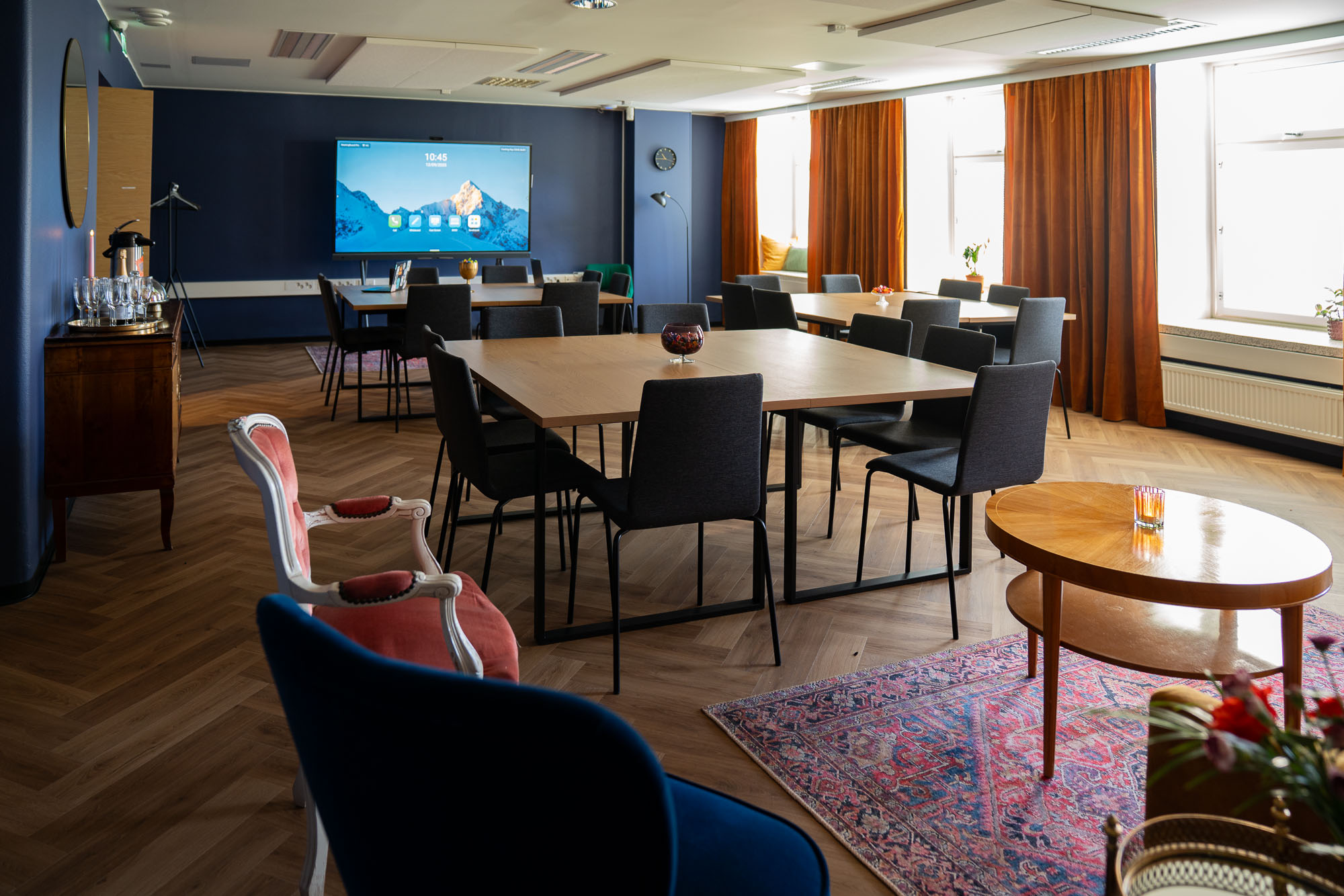 Haluaisitko kokoustaa rennosti nojatuoleilla istuen? Siihen tarkoitukseen meiltä löytyy rento nojatuolikokoushuone, max 6 hlö.